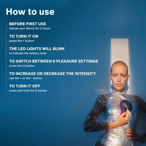 - 8 SETTINGS: From a teasing murmur to a satisfying pulse.