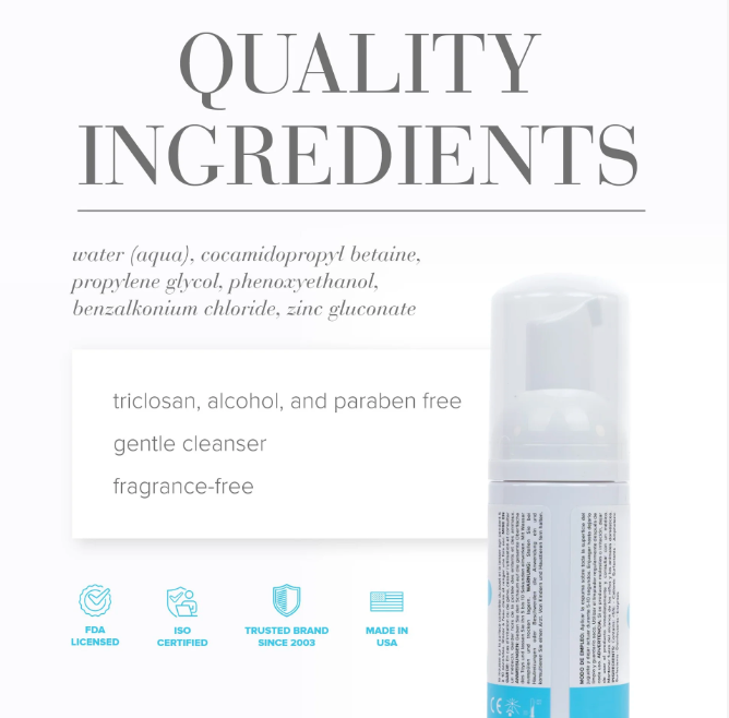 - Material/Ingredients: Water (Aqua), Cocamidopropyl Betaine, Propylene Glycol, Phenoxyethanol, Benzalkonium Chloride, Zinc Gluconate